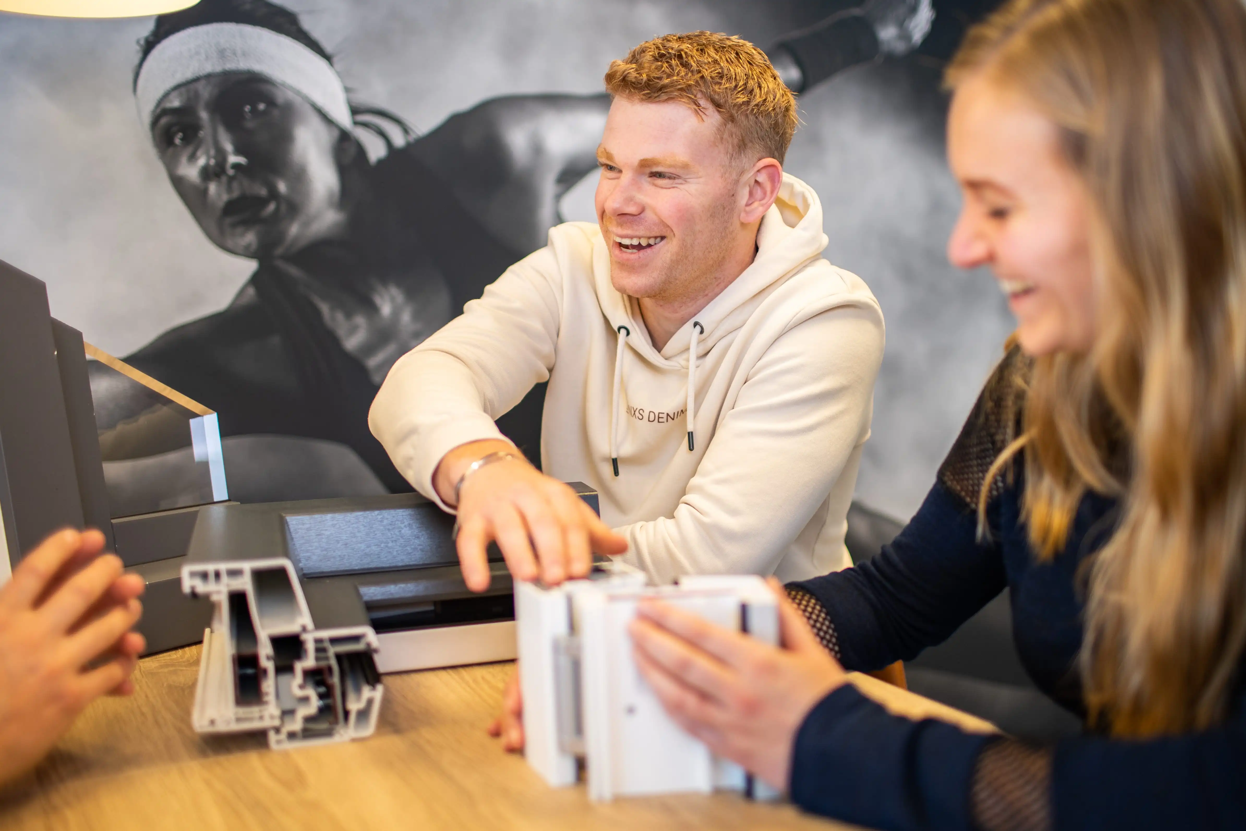 b. De schematische afbeeldingen van zowel ramen als deuren zijn altijd binnenzicht, dus hoe je van binnen naar buiten kijkt. De draairichting is te interpreteren aan de hand van de positie scharnieren en kruk op deze schematische afbeeldingen. De fotografische (foto-realistische) afbeeldingen van de deurpanelen zijn buitenzicht en dienen om de design te interpreteren van de deur. Dit design is illustratief en kan bij uitvoering afwijken volgens het gekozen formaat van de deur.
