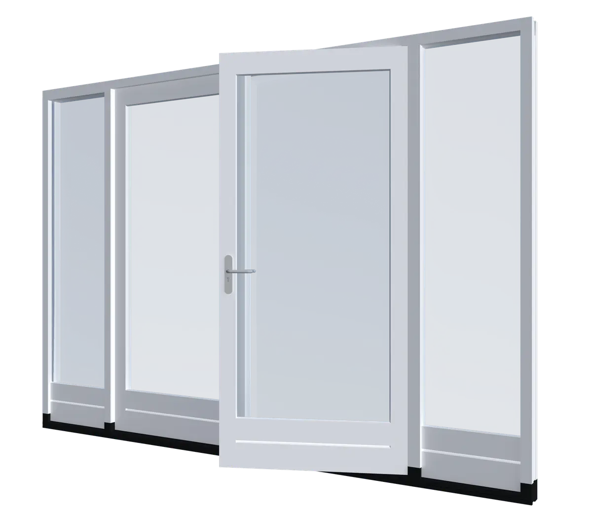 Deze houten tuindeuren kunnen samengesteld worden met verschillende profielen. De tuindeuren draaien naar buiten en bevatten twee zijlichten, die voorzien zijn van een borstwering. Bij het samenstellen kan een keuze gemaakt worden uit verschillende opties voor de beglazing.