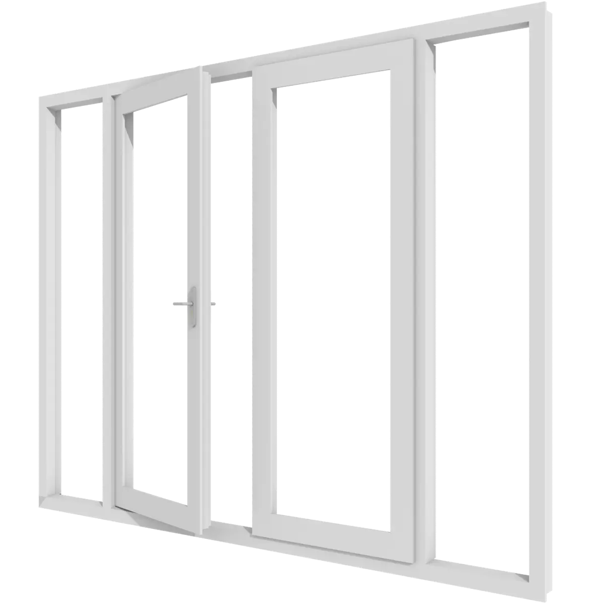Deze dubbele tuindeuren kunnen samengesteld worden met verschillende pvc-profielen. Ze draaien naar buiten en kunnen bijvoorbeeld gebruikt worden om een mooie overgang te creëren tussen het huis en de tuin. De deuren worden stolpdeuren genoemd omdat er geen staander tussen de deuren zit. Bovendien bevat dit profiel twee zijlichten aan beide kanten van de tuindeuren. Dit laat extra lichtinval toe.